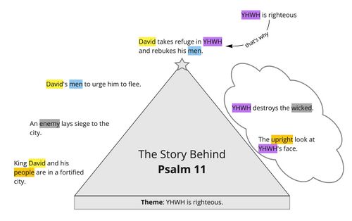 (You say all this because you are forgetting who YHWH is.)(YHWH, in whom I have taken refuge) (is the supreme king over the whole world). YHWH is in his holy temple (in the heavens). YHWH - his throne is (not on the earth but) in heaven. (Just as it is the responsibility of an earthly king to execute justice in his land)(so YHWH will execute justice in the world). (In order to execute justice, YHWH needs to know who is righteous and who is wicked). (That's why) His eyes observe. (That's why) His eyelids test humans (like a goldsmith tests a precious metal to determine its quality).