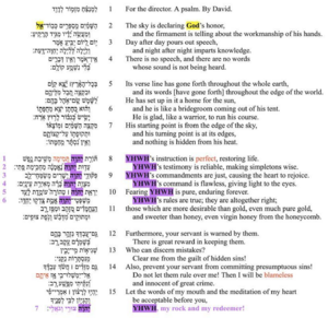 - The second half of the psalm, however, refers to this God by his personal name YHWH.[1] Only Israel used this name for God. The divine name YHWH clusters in verses 8-10, occurring six times within the space of six lines. This section of verses identifies YHWH as the God whose covenant instruction is perfect (verse 8).
