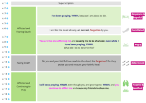 This At-a-Glance visual is explained in detail on the Overview Page of the User’s Guide. The important point to highlight here is that for each section of the psalm the main emotion of that section is displayed in a pink box on the right. This allows you to see a high level view of the psalm as a whole, its main sections, and the overall emotions corresponding to those sections.