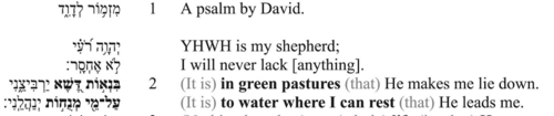 Here you can see text laid out clause by clause, with the Hebrew on the left and the CBC on the right. In this layer, however, the CBC has been expanded to draw out important information. As you can see here, “in green pastures” and “water where I can rest” are in bold. This is because in Hebrew these words are in focus; they are positioned at the beginning to indicate their role as the primary contribution of the sentencePrimary contribution usually, but not always, overlaps with "new" information..