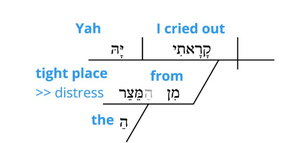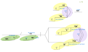 Prepositional Phrases: A prepositional phrase is the combination of a preposition (e.g. לְ, בְּ, עַל, עִם…) with one or more other words. In this case the preposition modifying the verb “sing” is to (לְ), followed by the recipient YHWH. In the diagram the preposition is provided on a slanted line and any words dependent on the preposition follow on a horizontal line.
