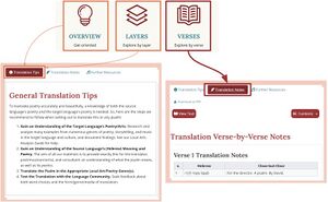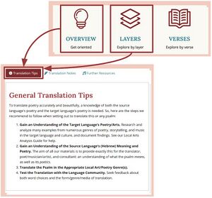 As the arrows in the image to the right show, the resources for the Translation Overview are taken mostly from our Layer by Layer resources as well as the psalm Academic Overview page. This page is made up of 7 tabs covering key information which any translator should keep in mind for this psalm. In translation, verse-by-verse accuracy is important, but it is just as important to create a translation that is faithful to the psalm as a whole. In each tab we reorganize the resources from our layers and overview page into brief presentations. If users wish to explore any of the materials in more depth, links are provided to the corresponding pages in the rest of our resources.