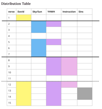 The Distribution Table shows where in the psalm different participants appear and where they interact with other participants. This can show important patterns in the psalm and even sometimes intentional poetic design.