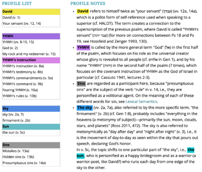 • For every line of the psalm we identify the speaker and addressee and highlight them according to the unique highlight color shown in the profile list above.