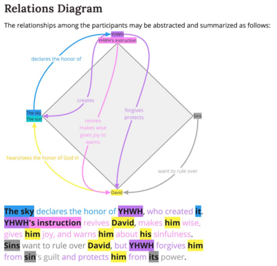 The main question of participant analysis is “who is who in the Psalm?” For every verse, we show who is the speaker, who is the audience (which we refer to as the addressee), and who is being referred to within the text iself. For some psalms, identifying these participants is quite straightforward, while for others it can be very unclear and difficult to determine.