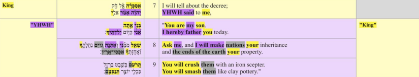 • The background of the text is colored according to the color of the speaker. Sometimes, a participant quotes another participant. These quotations are called embedded speech, and in these cases only the middle columns in the participant table change color (not the speaker column!). For example, in this example from Psalm 2 below, the king quotes YHWH, and the speaker column stays yellow (the king's color), but the middle columns become purple (YHWH's color).