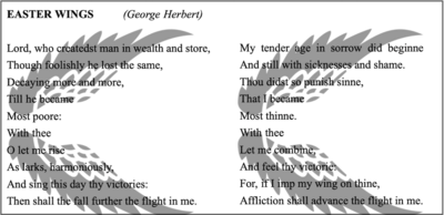 Compare, for example, "Easter Wings" by George Herbert. The poem uses the image of wings, flight, and rising from suffering—but Herbert didn’t just say that. He painted it - shaping the words themselves into two sets of wings.